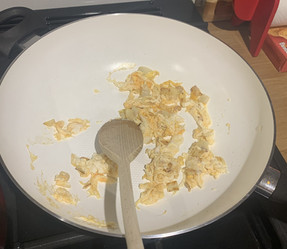 When egg has cooked a little into a scramble (30-45 seconds) add in the cold boiled rice.